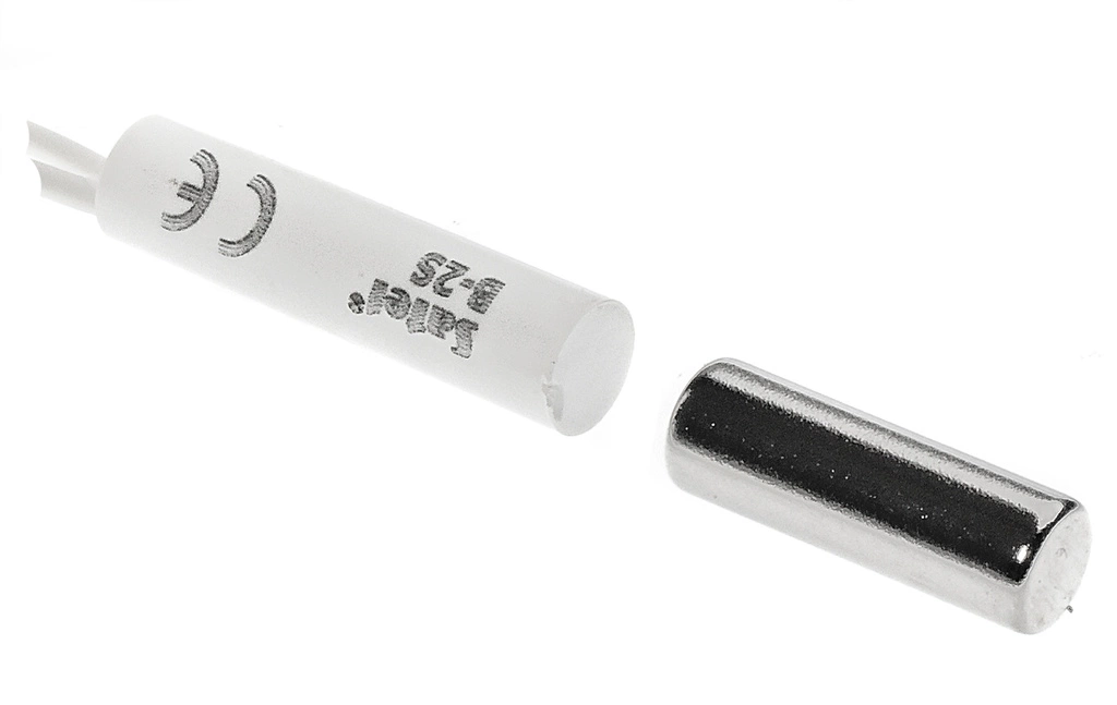- Miniature hermetic NC reed detector for perimeter protection of doors and windows, recessed mounting in sash and frame, reed contact opening distance 33 mm.