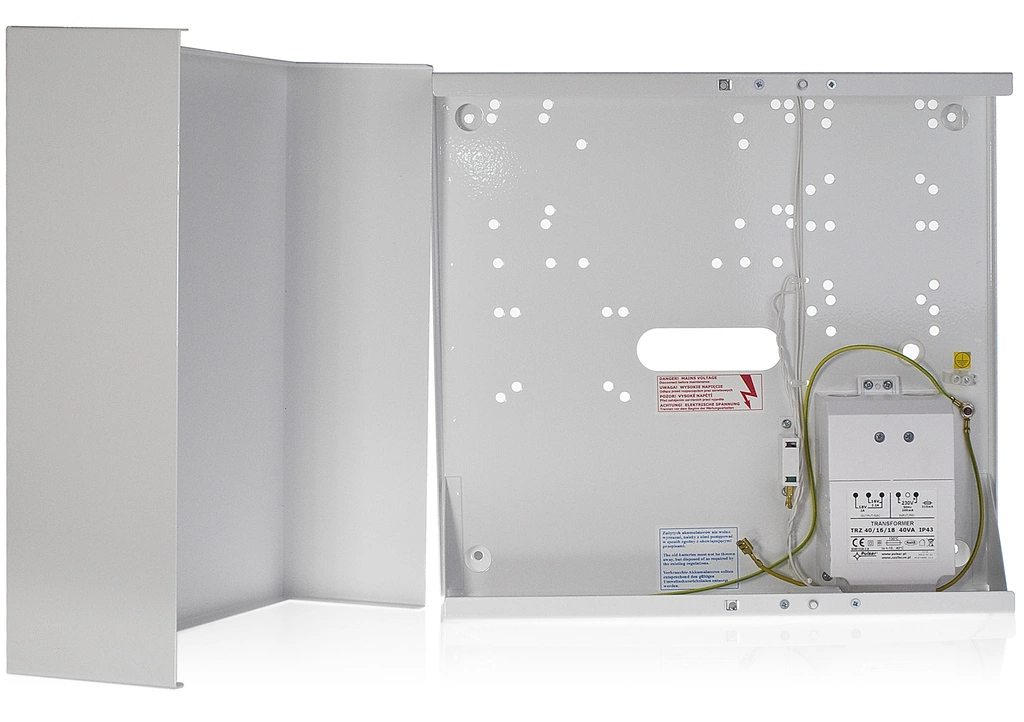 Surface mounted metal power supply enclosure SATEL OMI-2 box with transformer 18 V AC 40 VA EN50131 G3