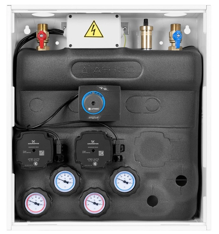 PrimoBox AZB 205 es un conjunto hidrónico compacto que integra dos circuitos en un único armario: - un circuito sin mezcla (directo) - un circuito con una válvula mezcladora ARV y un actuador ARM ProClick El conjunto se suministra también con un acoplamiento hidráulico, que garantiza la estabilidad de la presión entre los circuitos. La potencia máxima del conjunto es de **35 kW**