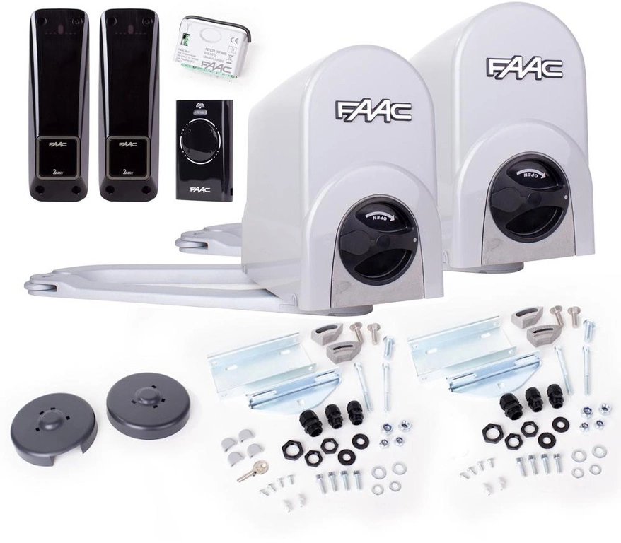 Ensemble complet basé sur les actionneurs FAAC 391, fiables et éprouvés, conçu pour l'automatisation de portails battants avec des longueurs de vantail jusqu'à 2,5 m et des poids jusqu'à 300 kg, ce qui permet d'actionner un portail avec une longueur de passage jusqu'à 5 m. Les opérateurs à rupture de charge FAAC 391 s'adaptent à tout type de poteau, qu'il soit métallique ou en clinker