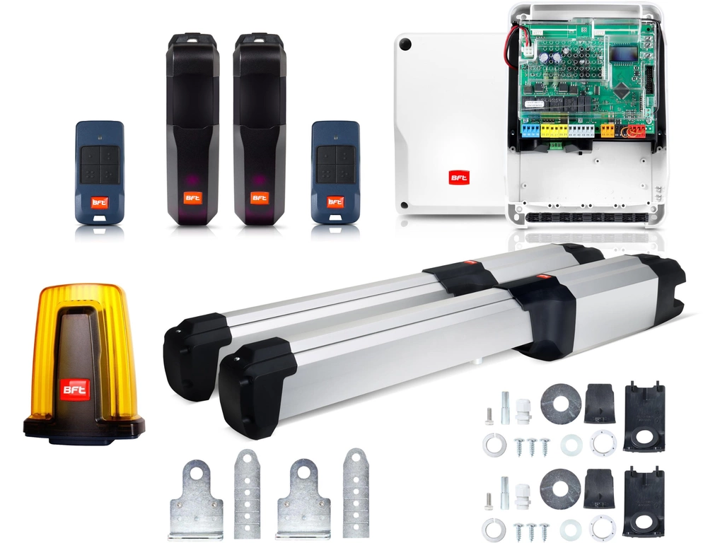 Kit d'automatisation com-pLetable BFT pour portails battants jusqu'à 2,5 m par vantail. Inclus : opérateurs PHOBOS BT B25, centrale THALIA BT A80 DUO, photocellules, télécommandes MITTO et lampe à LED Radius BFT avec antenne.