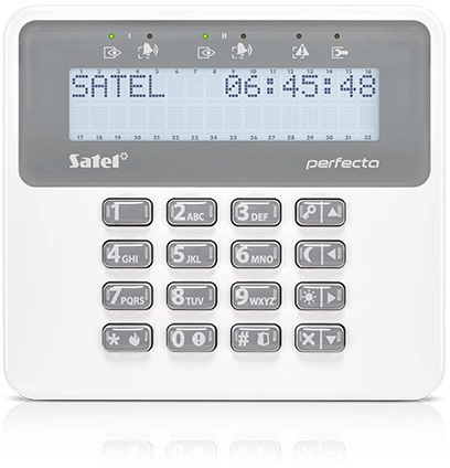 - PRF-LCD Tastiera Perfecta per sistemi di allarme SATEL funziona con le centrali della serie PERFECTA. È dotata di un ampio display LCD di facile lettura, di LED che informano sullo stato delle partizioni e del sistema e consente di attivare rapidamente la